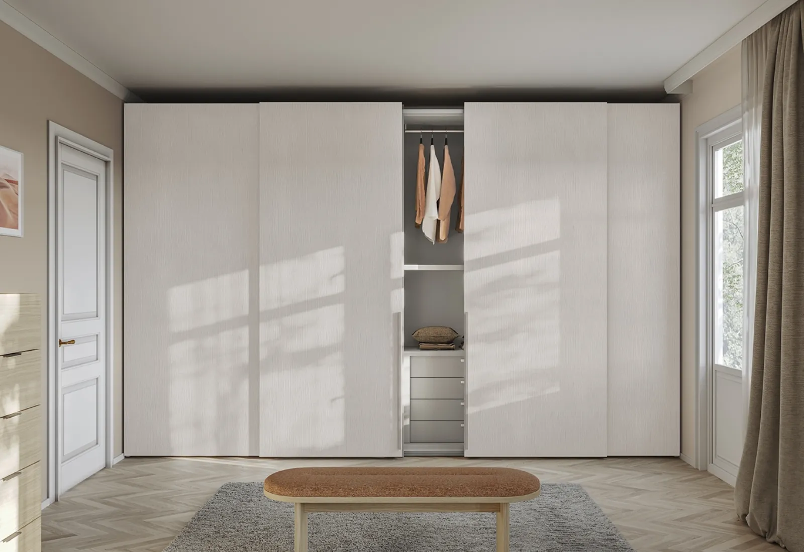 Gli Armadi a muro con ante scorrevoli sono componenti immancabili nella camera da letto, per renderla arredata al meglio, funzionale e completa di tutto. Per progettare ottimamente una stanza bella e funzionale, opta per le più esclusive soluzioni dei migliori brand, letti, armadi e comodini di elevata qualità. Contattaci e ottieni informazioni sulla nostra linea di Arredamento Casa: sarai in grado di completare la zona notte utilizzando una ricca gamma di mobili contenitori moderni, come l'armadio in melaminico nell'immagine.
