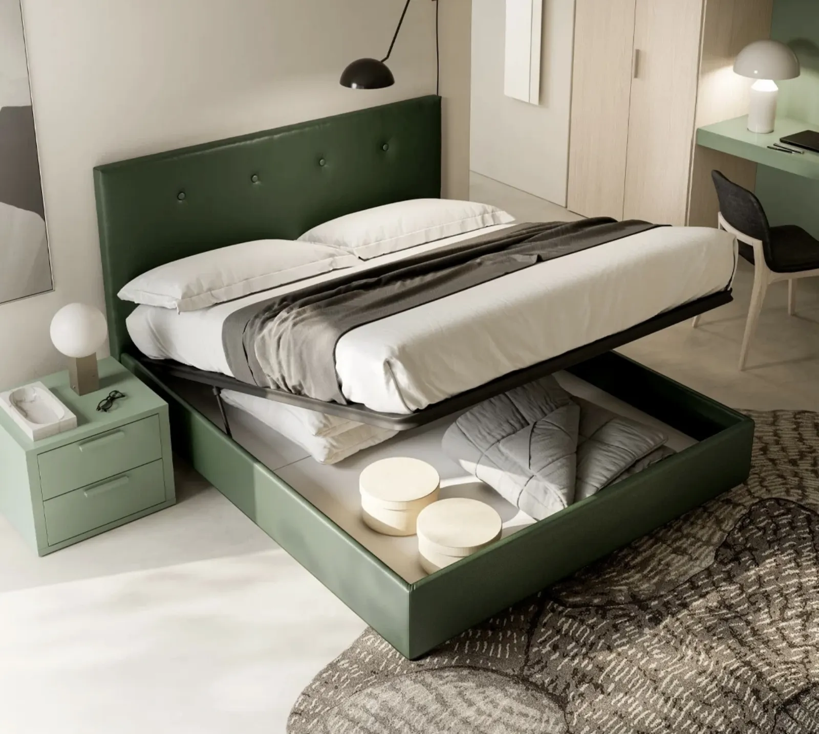 Per ultimare perfettamente l'arredo della tua camera da letto è indispensabile valutare gli accostamenti del letto con armadi e comodini, accessori e quant'altro: se desideri mobili moderni, il modello nella fotografia fa per te. Contattaci e ottieni informazioni sulla nostra linea di Letti matrimoniali con contenitore: valorizza la tua zona notte con le nostre composizioni. Questa è un prodotto di grande classe, che porta con sé tutta la qualità garantita dalla pluriennale esperienza del brand nel campo.
