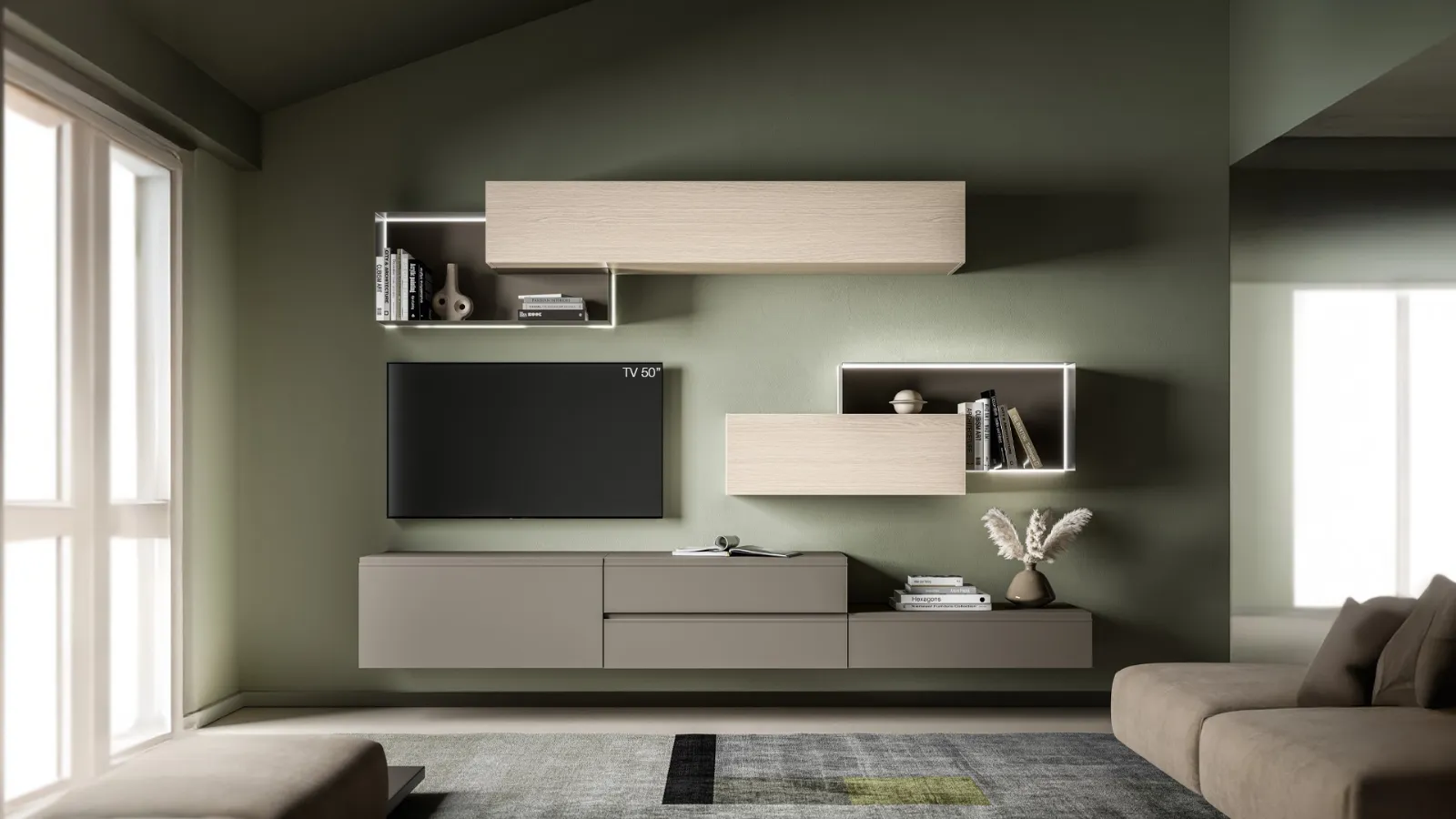Attraverso un gioco dinamico di accostamenti fra elementi a giorno o vani chiusi, le Pareti Attrezzate moderne arredano il soggiorno ottimizzando ogni spazio. Le Pareti Attrezzate hanno conquistato un posto di primo piano nella zona giorno delle nostre case: sono mobili multifunzionali e salvaspazio sempre realizzabili su misura per te. Questa parete attrezzata è una delle soluzioni dell'azienda e ti permetterà di progettare il living secondo le più particolari esigenze abitative.